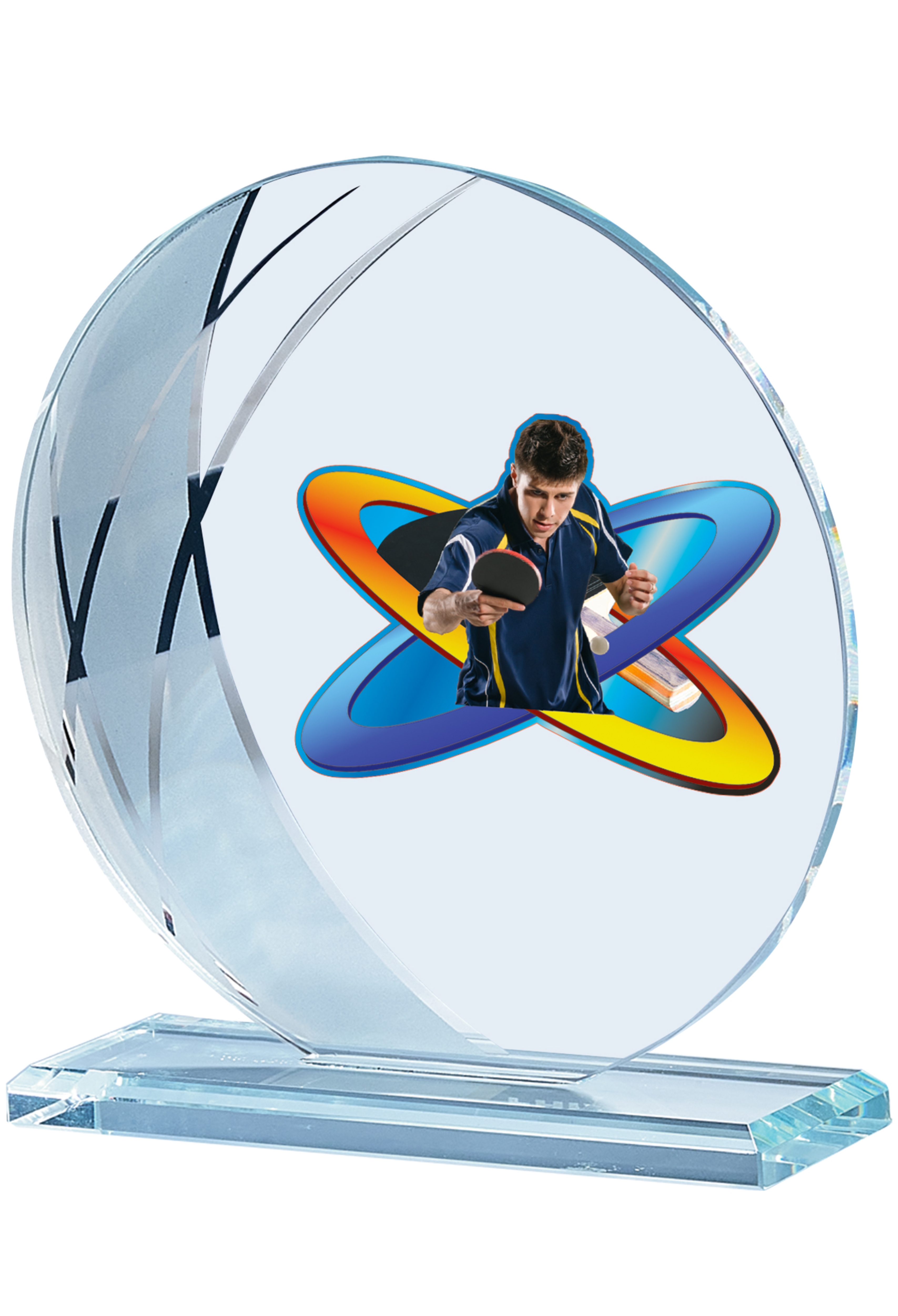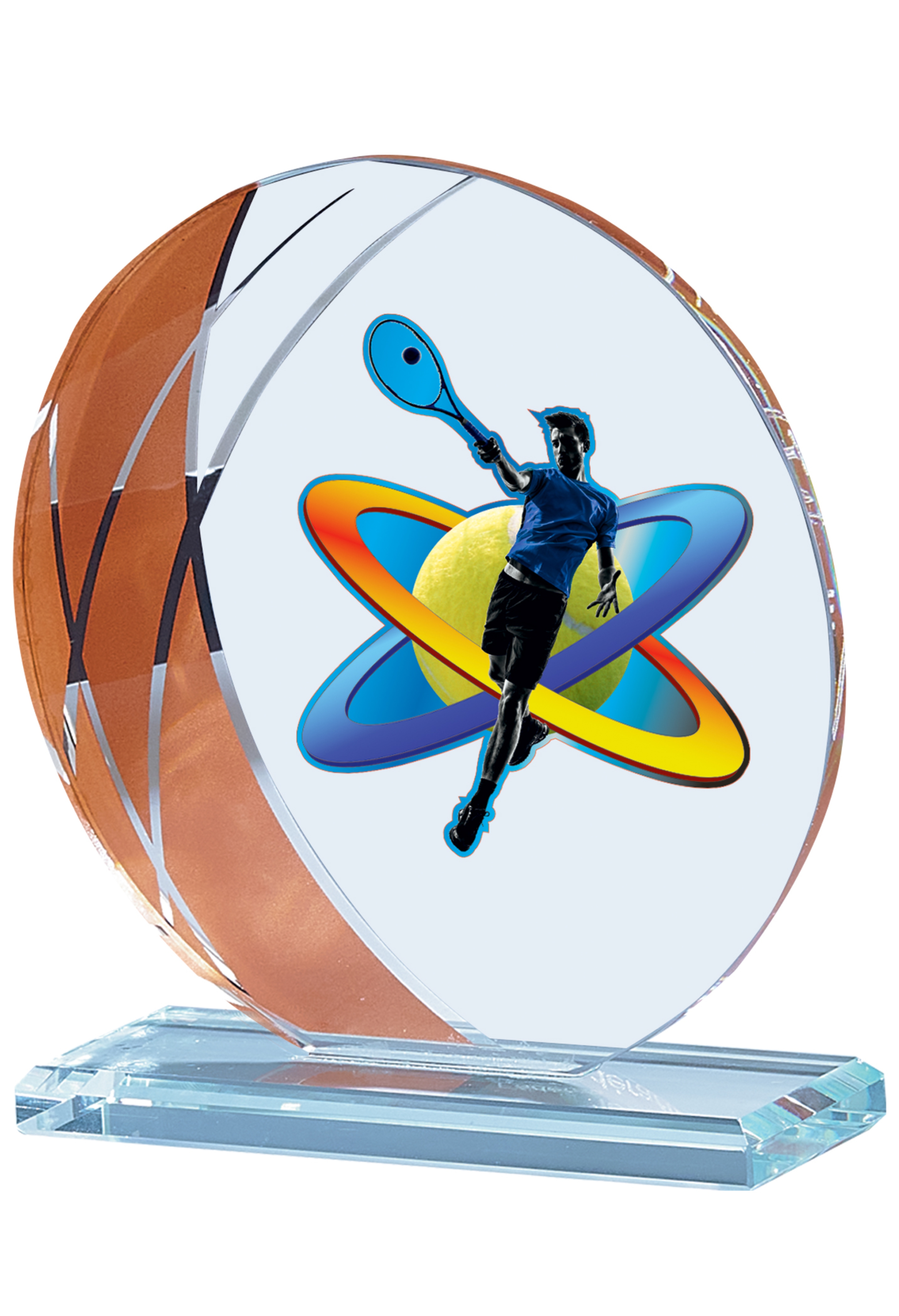 Glas Trophäe mit einer geschwungenen Form mit Gold-Silber-Bronze Akzenten am Rand. Das Emblem und das Gravurschild ist direkt aufgeklebt inkl. Fassung für Emblem